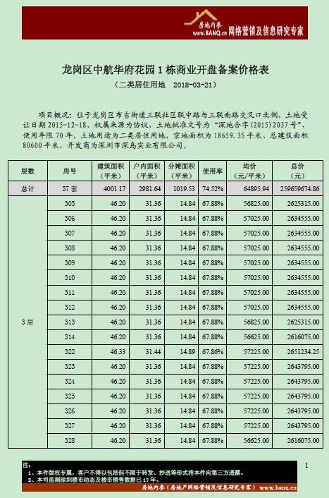 今天,本司发布龙岗区中航华府花园1 栋商业开盘备案价格表的节录,未来遇有新盘价格表,本司都将发布节录,供大家参考。
