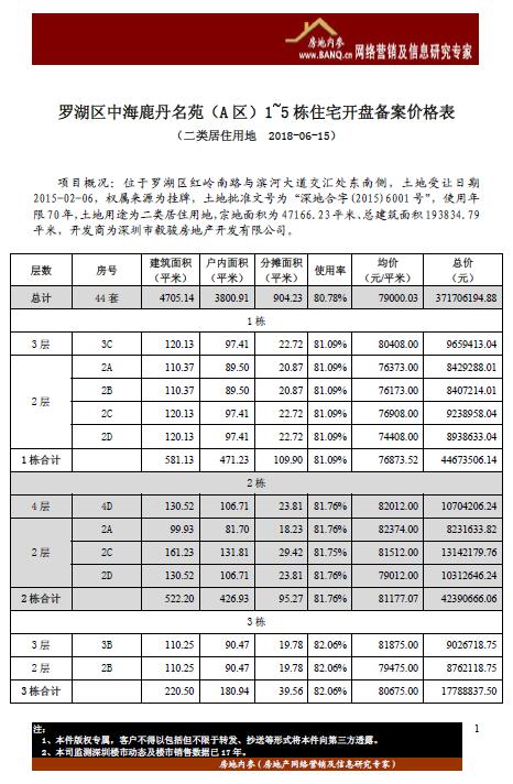 今天,本司发布罗湖区中海鹿丹名苑(A 区)1~5 栋住宅开盘备案价格表的节录,未来遇有新盘价格表,本司都将发布节录,供大家参考。